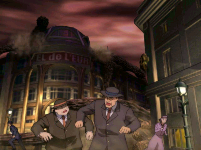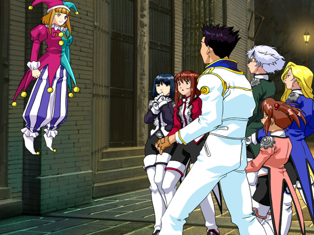 Oogami is having a dream, he sees Erica floating before him, and then the others. He calls out to them, but they do not respond. The strange figure appears again, and when Oogami challenges them, asking what they've done to his friends, it retorts "Just what is it that is your enemy?" Oogami angrily replies that his enemies are all those what pose a threat to peace. The figure rebuts that if that's true, then those girls shouldn't be his friends, because within them lies the same blood as the Kaijin that he has fought earlier. Bewildered, Oogami asks what is going on. The figure replies that their blood is the blood of the Parisi, which is an ancient bloodline. Oogami asks what that has to do with anything, and the figure says it's his destiny to fight all those who bear the blood of the Parisi. Oogami wakes in a cold sweat, glad it was just a dream, but still mystified as to what the "Parisi" could be. Still, he reasons, they defeated Calmar, so peace has returned to Paris. He decides to walk about the city and enjoy it now that it's at peace once more. At the bar, the bartender tells him Lobelia's drunk too much and won't get up. He refuses to try and wake her because if he tried the whole place would get burnt down. Oogami tries to wake her by tickling her (which gets the Bartender to call him a pervert) and then pretending to be Erica to try and rouse her peaceably. Lobelia wakes up angry and the bartender rats out Oogami, saying he woke her. Angrily, Lobelia hits him, reminding him that she wakes up angry. Erica says that when she sleeps angels play tricks on her and shove her on the floor. Oogami reasons she has bad sleeping posture. In Grand Mere's office, she tells Oogami that he did a great job at the Isle of Cite, but her instinct tells her things aren't over yet. Oogami agrees that he's felt something as well, and he asks her about a mysterious Pierrot. Grand Mere says she doesn't know anything about such a being but she will look into the matter. Lobelia finds Oogami and and drags him to a fashion boutique "for those who walk the back roads". She demands Oogami try on some suitable clothes, remarking that she's tired of seeing him in those "country clothes." Oogami's shocked that she wants him to wear clothes like that, and Lobelia tells him that if he doesn't wear them he can't walk Paris at night. Oogami says that he likes his old clothes best, as those are his uniform, and Lobelia approves, stating that any man who's set in his ways can also look sexy. She grumbles that dressed like that he's going to bring down her style, but to make it up to her he can take her out to dinner that night or she'll quit the Paris Floral Assault Squad. Oogami agrees. Later, Grand Mere tells Oogami there's a special duty she wants him to perform for her, and Mell also requests it, saying it's a "Very special duty". Ci chimes in that of course Oogami will do it, because it's his duty. The looks on their faces fills Oogami with suspicion. After the night's performance, Erica and the others find Oogami and ask him to come with them. They reveal that a new dance hall has been opened near Chattes Noires and it might end up being competition for them. They want to check it out. Oogami realizes he has plans with Lobelia and tries to get out of going with the others by having Lobelia say she needs his help with something, but Lobelia says that she needs help cleaning, which no one believes and they insist that Oogami go along with them. Oogami keeps trying to confer with Lobelia which just makes the others suspicious. He manages to worm out of checking out the new place and decides he will go out with Lobelia, but first he needs to check with Grand Mere. Upon entering Grand Mere's office he finds Mell and Ci dressed fashionably. Grand Mere tells him to get dressed fashionably as well and wait for them on the porch. Oogami wonders just what kind of duty they could have in mind, but dresses up in a fashionable suit and heads out to meet them. The three of them then take him out to a dance hall. Oogami wonders what kind of duty would require him to go to a dance hall and they're amused that he really thought it was an assignment-- that he really is that strait-laced. Oogami then asks what it is exactly that they are doing, and they tell him that he's worked so hard since coming to Paris that he deserves a night off. He dances a bit with Mell and Ci. Mell talks to him about the fact that he will have to go back to Japan someday, and she gets a bit sad about it. Grand Mere reveals that she's pleased with how Oogami's grown since coming to Paris; that he used to be a bewildered almost-bumpkin-like figure in the face of the grandeur of Paris, but now he's grown into a cultured young man. She reminds him that soon it will be time for him to go back to Japan, but she isn't quite done with making him a gentleman. She then excuses Oogami for the night, slyly noting that he seems to have other plans for the evening. Oogami then makes his way to meet Lobelia. He apologizes for being late. Lobelia replies that for making her wait, she's going to make him make up for it with some of the finest quality wine. She says she's going to take him some place "Really nice." Hearing that, Oogami tells her that when she says it that way, he gets a frightening feeling. Lobelia is amused and tells him he'll just have to wait and see where it is. She takes him to the top of a hill that overlooks all of Paris and reveals that back when she was thief all the time, she would some up there to rest. She muses on the fact that night-time scenery can take the same place and make it some place totally different than what it is in the daylight. Oogami agrees, reflecting that day and night can show people entirely different sides of the same thing. Lobelia then continues that while that might be true for places, for people, villains are villains through and through, and good guys are good. She remarks that she's taken a liking to him but 
