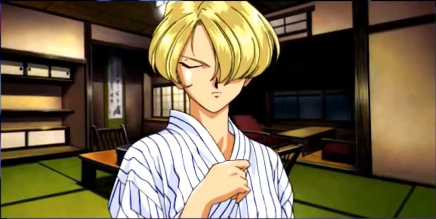 At the Ryokan, Oogami is relaxing when he hears Sakura, Saki and Maria approaching. Both groups realize with horror it's a mixed bathing area.