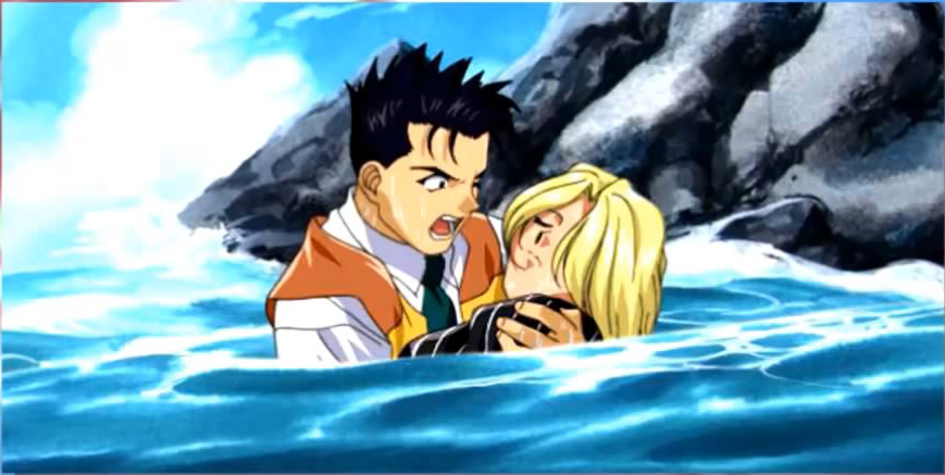 Getting her out of the water, he gets her on the bleach and almost has to use artificial respiration on her.... but she wakes up.