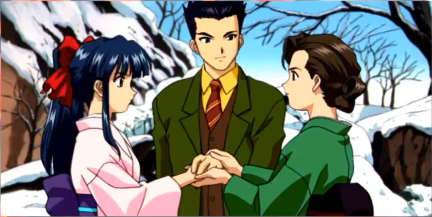 d (1926) Everyone is gathered together in the Theatre to celebrate the new year. Reni quietly gives everyone her regards, which causes Orihime to joke that she hasn't changed since the last year. Kanna jokes that a quiet, graceful girl is preferable to a noisy one-- the irony of which is not lost on Sumire, who calls out Kanna. Kohran proposes a Mochi pounding party, and Oogami begs her to to easy on everyone with the explosions in the new year, which causes Kohran to ask if maybe Oogami should be the one getting pounded. Kaede asks everyone if they've thought of new year's resolutions. Kanna says she's going to get stronger. Iris says she's going to become more of an adult. Orihime questions that as a resolution since obviously that's going to happen anyway. Sakura resolves to practice more with the sword so she can have a stance like her father's, that has no opening. To that end, she wants to go home to Sendai to practice. Sumire says she wants to go home as well, and Kanna wants to go to Okinawa to see her father's grave. Maria says she will go see Count Hanakoji, who has helped her in the past and give him New Year's greetings. Kohran wants to go back to Kobe to thank someone who's helped her, and Iris is excited that her mother and father will be coming to visit. Orihime joyfully reports her mother is coming from Italy to see her father. Oogami is happy that they'll finally be reunited. Later, doing his rounds he runs into Tsubomi, whose resolution is to finally overcome her clumsiness. He finds Reni, who says she is going to go with Kaede for the first shrine visit of the new year. After his rounds, Oogami goes back to his room and is greeted by Kayama, who's wearing a snappy suit. Oogami goes by train to see Sakura's Mother in Sendai . They take a stop by the tree that had been hit by lightning when Sakura was a child (the one that led to her having a fear of lightning) and there they meet her childhood friend Matsumoto Takeshi, who had been injured when lightning hit the tree. He has decided to become a doctor. Oogami goes to the ancient Shinguuji home and meets Sakura's mother Wakana. Oogami is allowed to lodge in Shinguuji Kazuma's room, and there he sees a picture of Kazuma with the others in the Anti-Kouma Interception Squad. Sakura remembers how gentle and strong her father was. Wakana has Oogami wear Kazuma's old Yukata. Wakana speaks with Oogami privately, explaining that she feels a little jealous of Sakura, who got to go out and live her life, as opposed to herself who lived a conventional home life. The next day, at her mother's urging, Sakura takes Oogami to see the graves of her father and the rest of the Shinguuji clan-- which she says are never shown to outsiders. They tell her father they are fighting to protect Teito just as he did, and then Oogami's Kinematron goes off. The enemy has been sighted in Ouji and the Shogeimaru is coming to pick them up. Wakana sends them off and urges them to be safe.