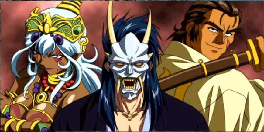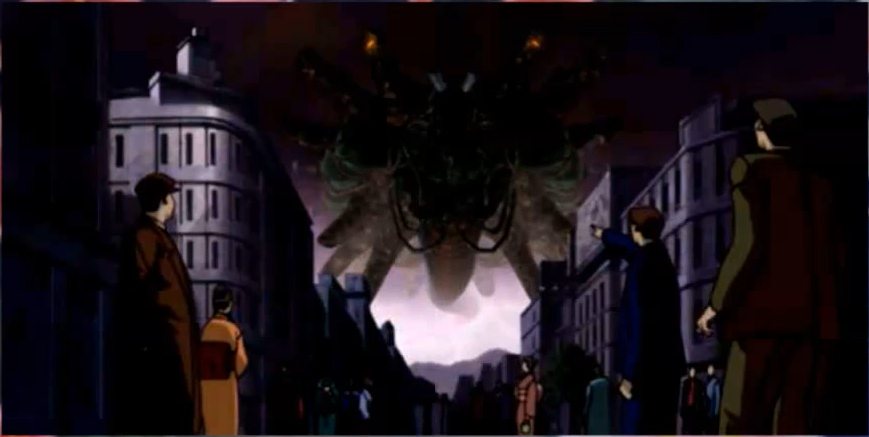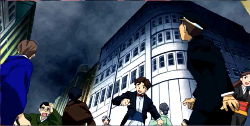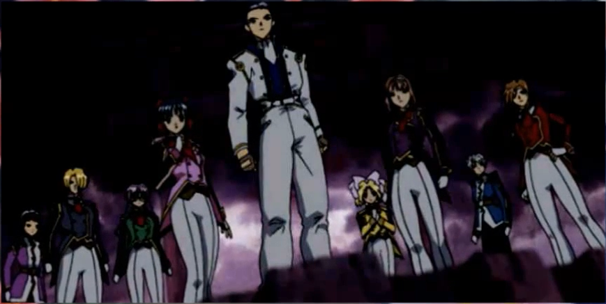 Elsewhere A voice declares that now that the Majinki-- the last things that would impede his dominion-- are lost it is time to begin. Summoning Tsuchi-Gumo, Kongou, and Oni-ou, Kyougoku Keigo -- who is somehow still alive-- prepares his advance guard of "Kouma Heiki". These Kouma are corpses of the Kouma that the army collected behind the scenes in secret during the Kouma War. Having the spiritual energy separated from their construction, their and reconstructed bodies mechanized, the army made them into ultimate weapons. He commands Tsuchi-Gumo and Kongou to go redeem themselves from their dishonor at Akasaka. He sends them to the place with the final seal, Ouji, where the final seal is in place... and then "Musashi" will be revived. When Oogami and Sakura get to Ouji, they're shocked to not see the rest of the troupe. Oni-ou, Kongou and Tsuchi-Gumo appear before them, shocking Oogami and Sakura, who blurt that they say them die at Akasaka. Oni-ou replies that until their ambition is realized, they will not die. Kongou laughs, saying that they've "paid back" the others for their prior defeat as well. To their horror, Oogami and Sakura see the other members of the TKD trapped in pillars of ice. Kongou says he wants to fight rhem, but he has orders to wait. Oni-ou tells the Kagekidan to "Look well... Upon the moment that the final seal of the Hachi-Kimon-Fuumajin is cast open~" Oogami gapes in shock and demands to know what "Hachi-Kimon-Fuumajin" is. Oni-ou explains it is the gates which seal in the cursed power of Teito... gates they are going to open. Oni-Ou incants "Blood vessels of evil that flows through this earth! The eighth gate that seals Teito......Open and reveal your form before me!" A giant shrine gate rises from the chasm behind him and giant Kouma appear. Kaede relays orders-- rescue the others but by all means defeat the enemy. As the battle begins, Sakura wonders how these Kouma can be here since they should have all been destroyed in the battle with Aoi Satan. They notice the Kouma have been augmented with machines, and Oni-ou declares proudly that this battle is a perfect testing ground for the Kouma Heiki. He tells them how in the battle two years ago the army seized the wounded Kouma and Kyougoku managed to develop them into a weapon in secret with Mokujiki's help, though the latter's death slowed things down. Eventually more and more members of the Kagekidan are freed, and they turn the tide on the Kouma Heiki, wiping them out. Eventually they corner Oni-ou, who gleefully declares that it's too late, "the time is coming". The time when everything will be as "that person" desires. From behind him, someone thanks him for his hard work, and tells the Kagekidan it's been a while. Kyougoku appears before them. They demand to know how he survived after taking his own life after the failed coup. Kyougoku quite reasonably explains that was a body double, and that the coup was nothing to him, he had much larger ambitions. Oogami demands what he's up to, and he replies that when he removes the final seal, the power of a vengeful spirit sealed deep beneath Teito will be released, and will purify the Imperial Capitol, changing it back to its rightful form. Sakura declares she won't allow this, and moves to attack Keigo, but Oni-ou draws his blade determined to cut her down, and Sakura recognizes the stance... She recognizes her father's stance, and realizes Oni-ou.. is her father. Oogami can't believe this could be true, and demands the truth from Oni-ou, who remains silent. Thus distracted, they don't realize Kyougoku has managed to undo the final seal. "Teito!" he screams, "reveal now your true form! All of that suffering and anger of yours, I, Kyougoku, shall accept!! Reawaken, Musashi!! Come, and show your power to me!!" The earth splits wide open. Massive bursts of evergy lance out from the area, striking key points across Tokyo. Energy screams into the sky and from the dark clouds above a shadowy colossus descends.... The vague outline of a flying temple can be seen looming over the city. As the Kagekidan watches, they see the gigantic structure float into view. Kyougoku continues his incantation, yelling out " Musashi.....Great cocoon to return the accursed Teito to its rightful form! Thou Insolent power released from Teito, drink up everything and, awaken the the great will that sleeps in its womb for this Kyougoku's sake! False Teito......That accursed mask, you may now tear off! The time for everything has begun to move. The accursed Teito erases its form -- and the true Teito finally reawakens! " NEXT TIME:  |